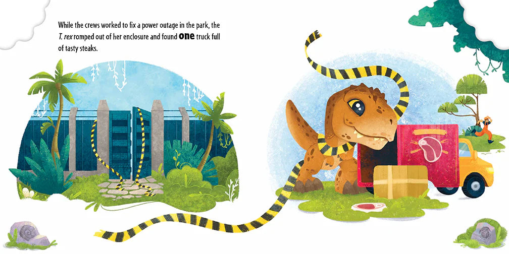 Follow the adventures of Jurassic World’s dinos as they eat their way across the island. The story begins with a very hungry herbivore gleefully chomping on foliage. Soon, the other dinos escape containment and playfully rampage through the park eating all manner of strange things.
